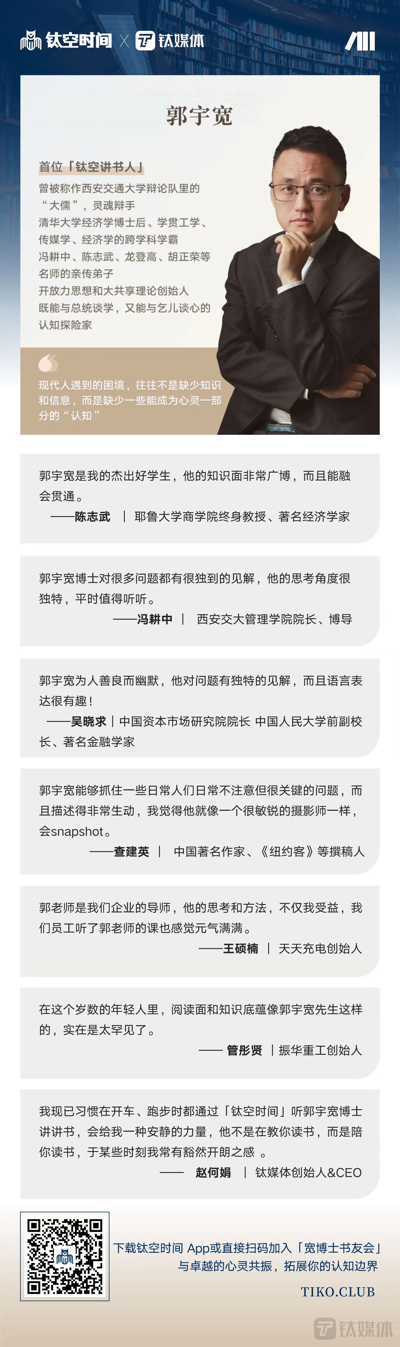 “钛空讲书人”是钛空时间App“书友会”的核心亮点,郭宇宽博士是钛空时间推出的首位核心“钛空讲书人”,他是非功能性读书理念的推崇者,开放力思想和大共享理论的创始人。在钛空时间,郭宇宽博士除了将通过“宽博士书友会”,在一年里至少带领大家深度阅读52本经典好书,还将与书友会会员日常保持实时的分享交流、线上线下对谈。著名经济学家陈志武、著名作家查建英、中国人民大学前副校长吴晓求、西安交通大学管理学院院长冯耕中等知名的学者和企业家都对郭宇宽博士推崇备至,认为他是年轻一代里博闻广识并能融会贯通的典范,他们也都成为了“宽博士书友会”的创始会员。