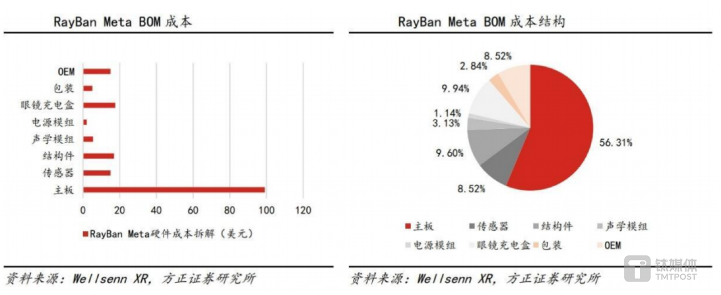 从成本角度来看,AI眼镜由于不含光显模组,核心成本仍以主板芯片为主,Ray Ban Meta主板成本占比超 50%。