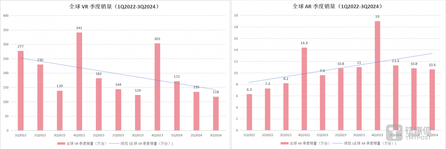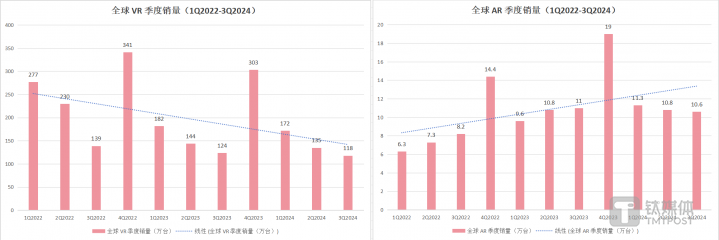 据韩媒 sedaily 报道,三星电子此前已制定了XR设备的生产计划,预计在2025年第三季度和第四季度分别出货2万至3万台以上。然而,横向对比来看,受制于重量、成本&售价、便携性,VR/XR产品短期内尚未快速放量。据wellsenn XR统计,2024年前三季度全球VR出货量下滑,AR出货量同比微增。苹果公司于2024年2月推出的Vision Pro头显市场表现不及预期;