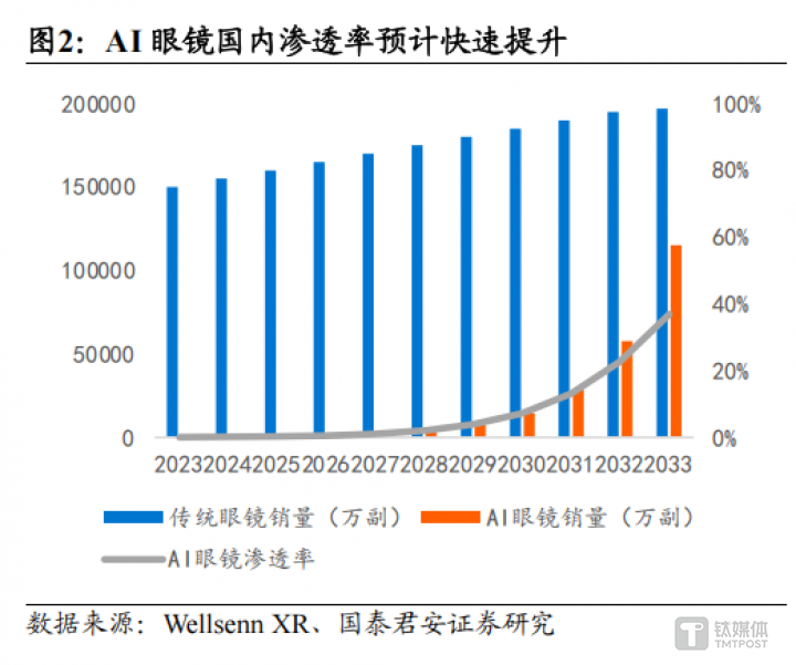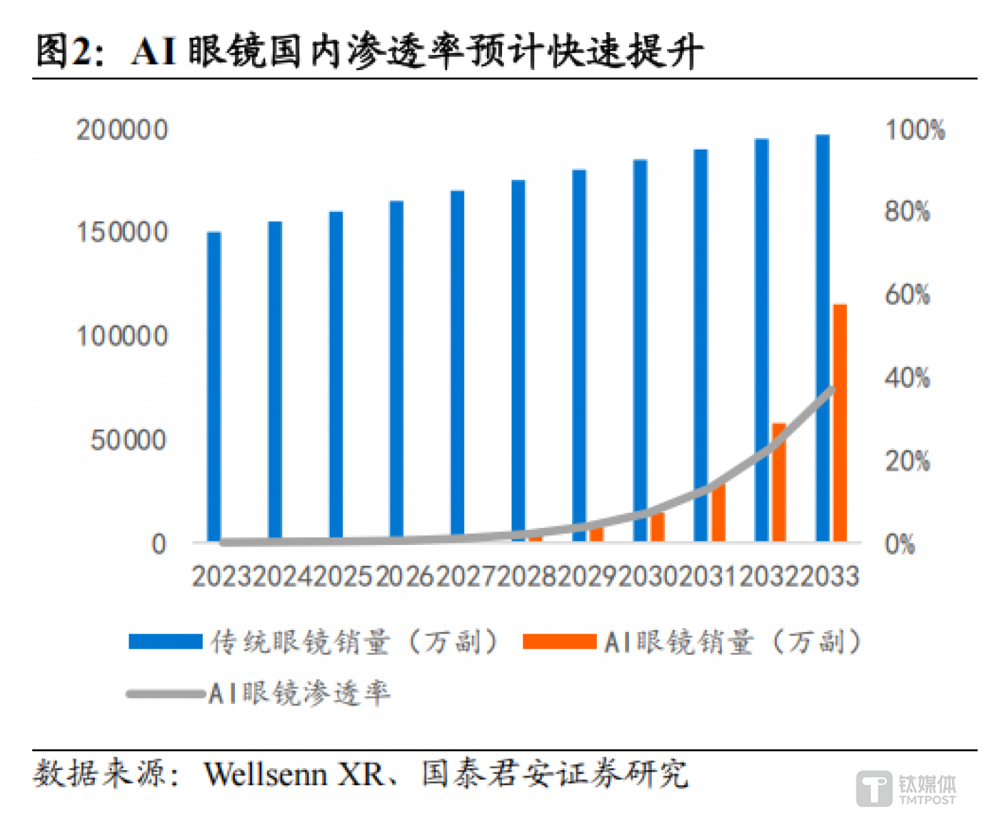 与之形成鲜明对比的是,2023年9月Ray-Ban Meta智能眼镜发布,起售价格299美元,随后迅速放量,目前已在全球销售超200万副,轻便型AI眼镜成为行业共识。wellsennXR预测,2025年开始,AI眼镜将快速向传统眼镜渗透。到2035年,AI眼镜销量有望达14亿副。