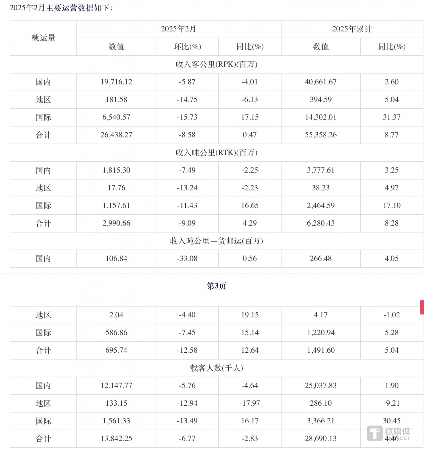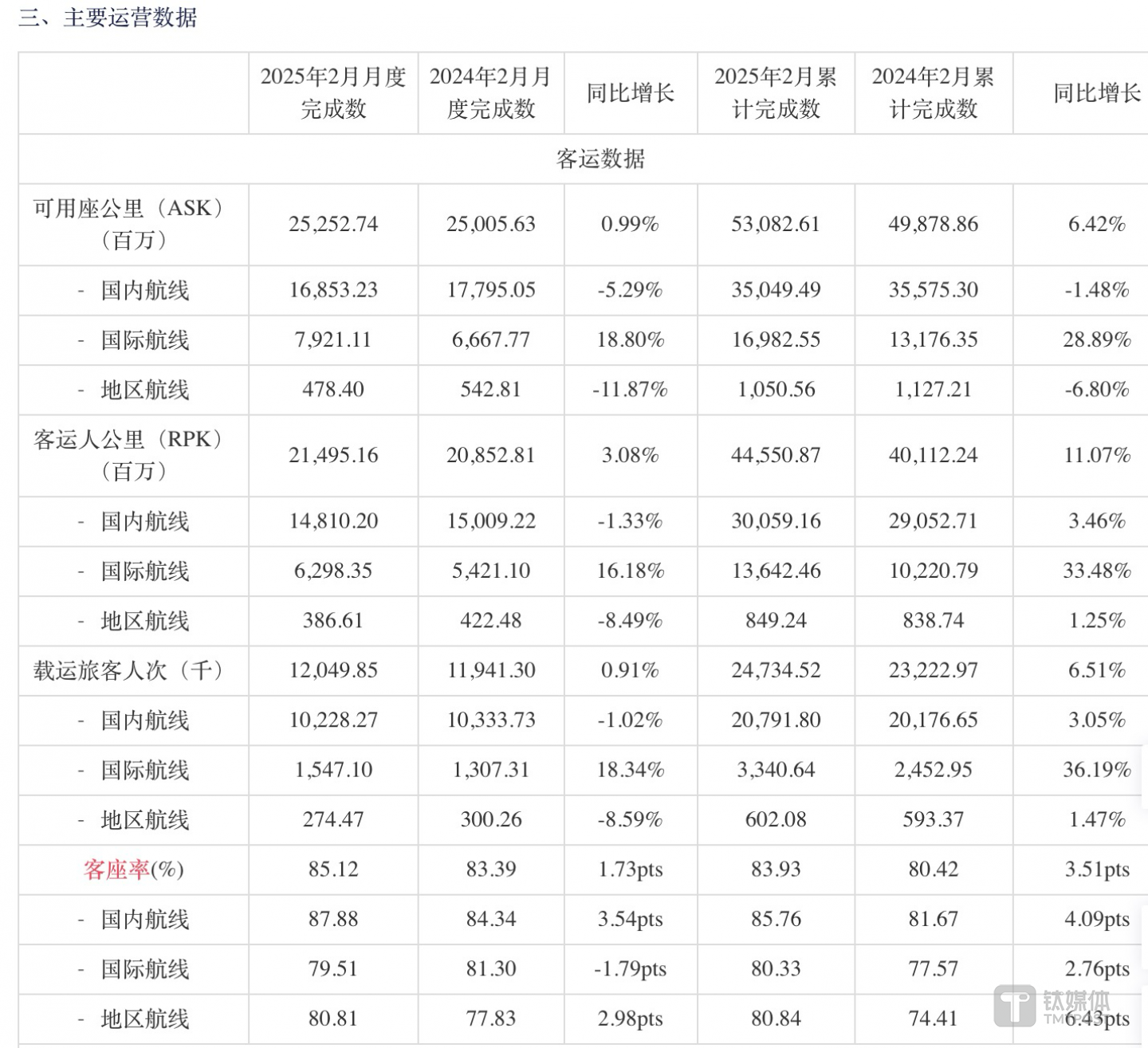 中国东航2月运营数据公告