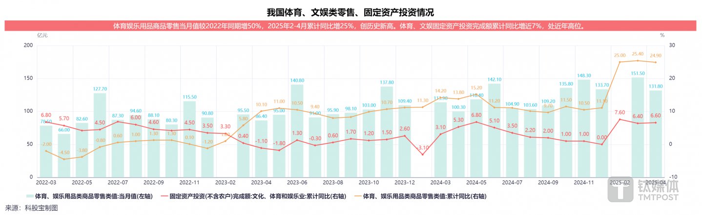 前4个月,体育娱乐用品社零增速创历史新高,显著跑赢整体社零5.1%的增速。2025年前4个月,我国体育娱乐用品商品零售当月值较2022年同期增50%,创历史新高。体育文娱固定资产投资完成额累计同比增近7%,处近年高位。