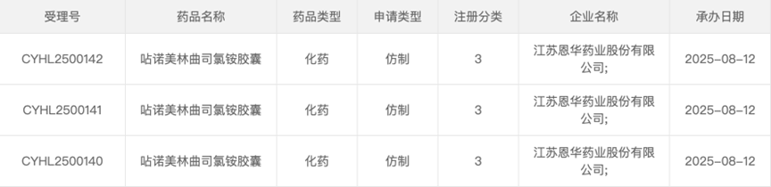 近日,CDE官网显示,江苏恩华药业股份有限公司(以下简称“恩华药业”)按3类化药注册申报的呫诺美林曲司氯铵胶囊上市申请获受理。恩华药业也成为国内首家提交该药品仿制申报的企业。