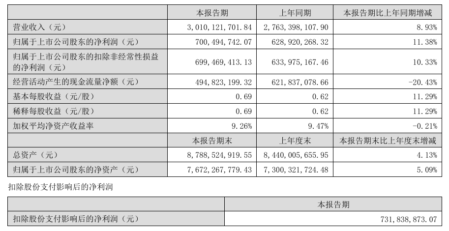 来看该公司最新发布的财报:今年上半年,实现营业总收入30.10亿元,同比增长8.93%,归属于上市公司股东的净利润7.00亿元,同比增长11.38%。
