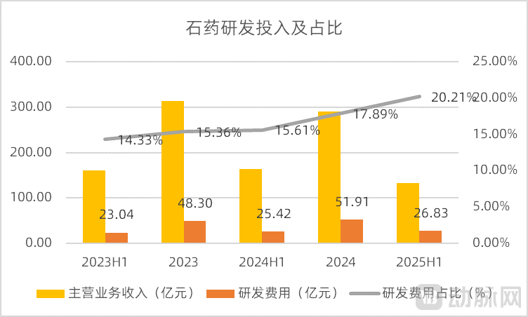 这背后是石药持续的研发投入支持。2025年上半年,石药的研发费用占比已经达到20.21%,呈现稳步提升的态势。