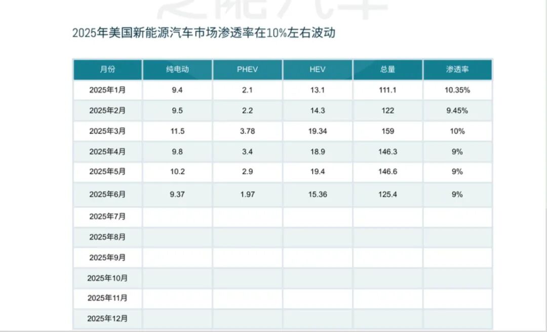 从渗透率来看,2025年美国新能源汽车市场渗透率一直在10%左右波动,可考克斯汽车公司将最新预测下调至8.5%左右。