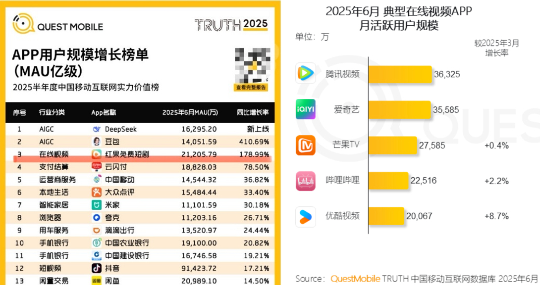 调研机构QuestMobile此前在《2025中国移动互联网半年大报告》中列出的一组数据被广泛引用,成为短剧侵蚀长视频市场的明证。数据显示,字节跳动旗下短剧平台红果短剧2025年6月MAU即月活达2.12亿,同比增长179%,首次超过长视频平台优酷2亿的月活规模。