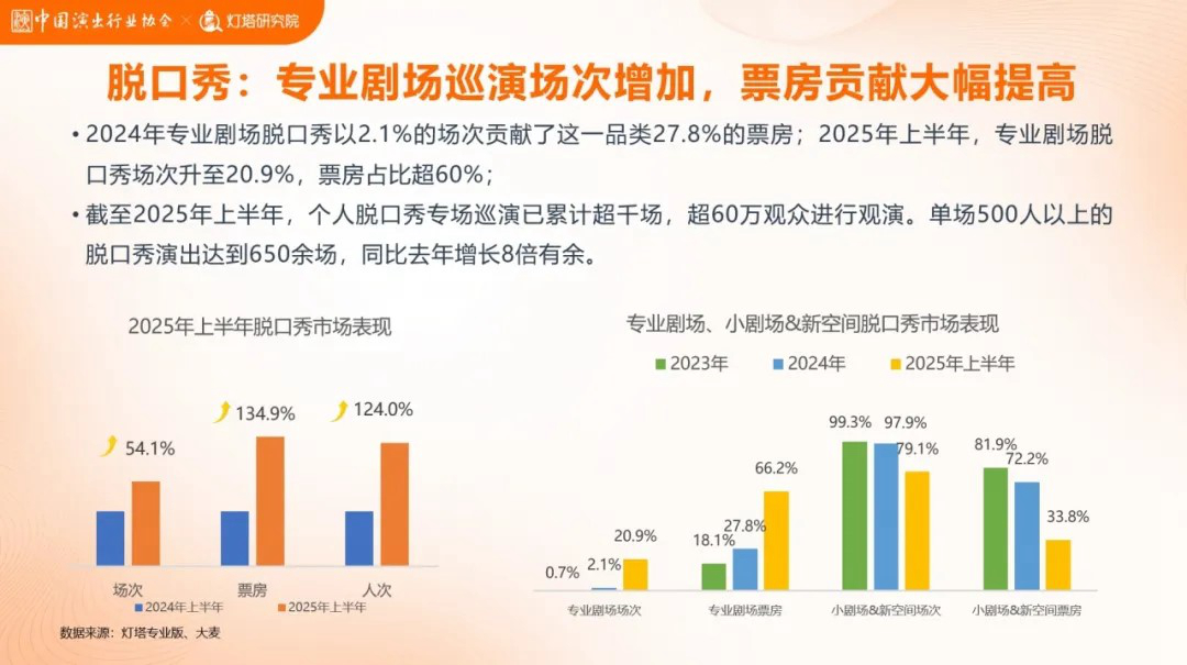 随着脱口秀线下市场升温,也有许多演员把重心放到了线下。2024年“轻舟已过万重山”(庞博语)后,脱口秀行业蓬勃发展。中国演出行业协会联合灯塔研究院发布的《2025年上半年剧场热门项目和消费趋势洞察》显示,2025年上半年脱口秀演出场次同比增长54.1%,票房同比增长134.9%,人次同比增长124.0%,脱口秀已成剧场类演出第二大品类,仅次于话剧。