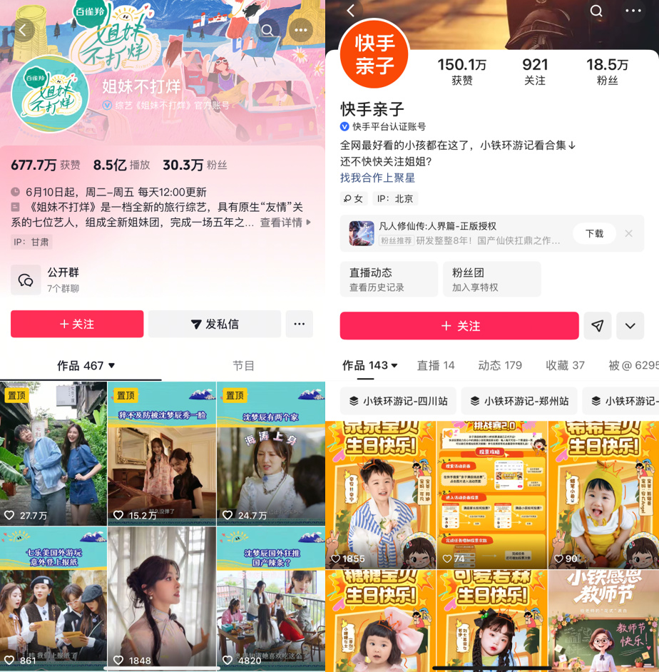 抖音、快手也频频在微综艺上试水,如抖音2025年6月上线旅行综艺《姐妹不打烊》,节目常驻嘉宾有知名歌手郁可唯、张含韵等,周更4期,每期时长只有20分钟;快手2024年推出亲子综艺《小铁环游记》,一期时长5到20分钟不等,在已更新的5季内容中,节目尝试以横屏、竖屏不同方式呈现内容。