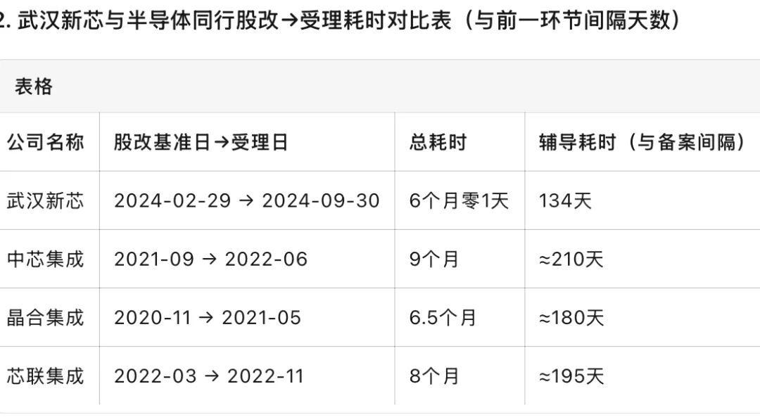 武汉新芯的IPO时间表可以概括为“3月股改、9月受理,中间零停顿”,真正做到了“股改完成即辅导、辅导结束即递表”。从“股改基准日”到“交易所受理”仅相隔185天,远超可比公司,放在整个A股半导体板块都堪称闪电速度。