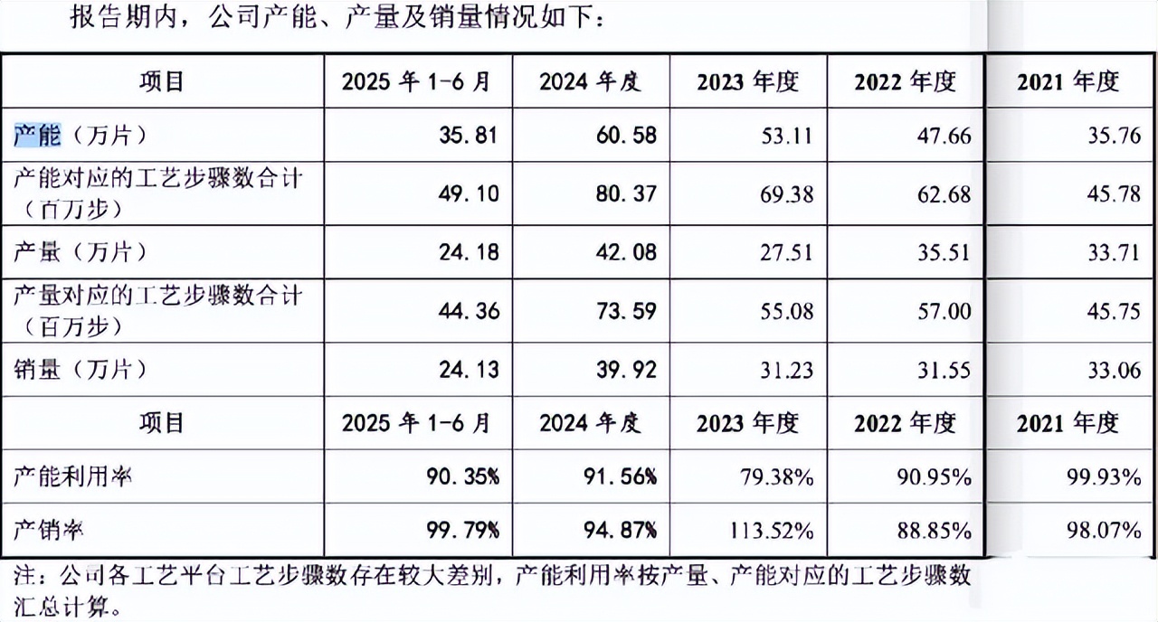 武汉新芯已披露的数据当中,产能利用率最为“亮眼”。2021至2025上半年,各报告期的产能利用率分别为:99.93%、90.95%、79.38%、91.56%、90.35%,几乎全程“打满”。不过,其计算出这些数据的方法却与行业通行方式截然不同。