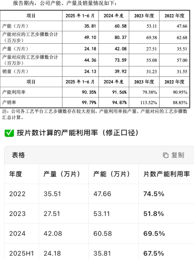 根据武汉新芯披露的产能与产量,若按物理片数重新产能利用率,呈现的是另一番景象:最低年份的(片数法)产能利用率仅51%,2024、2025H1两个报告期也均低于70%。