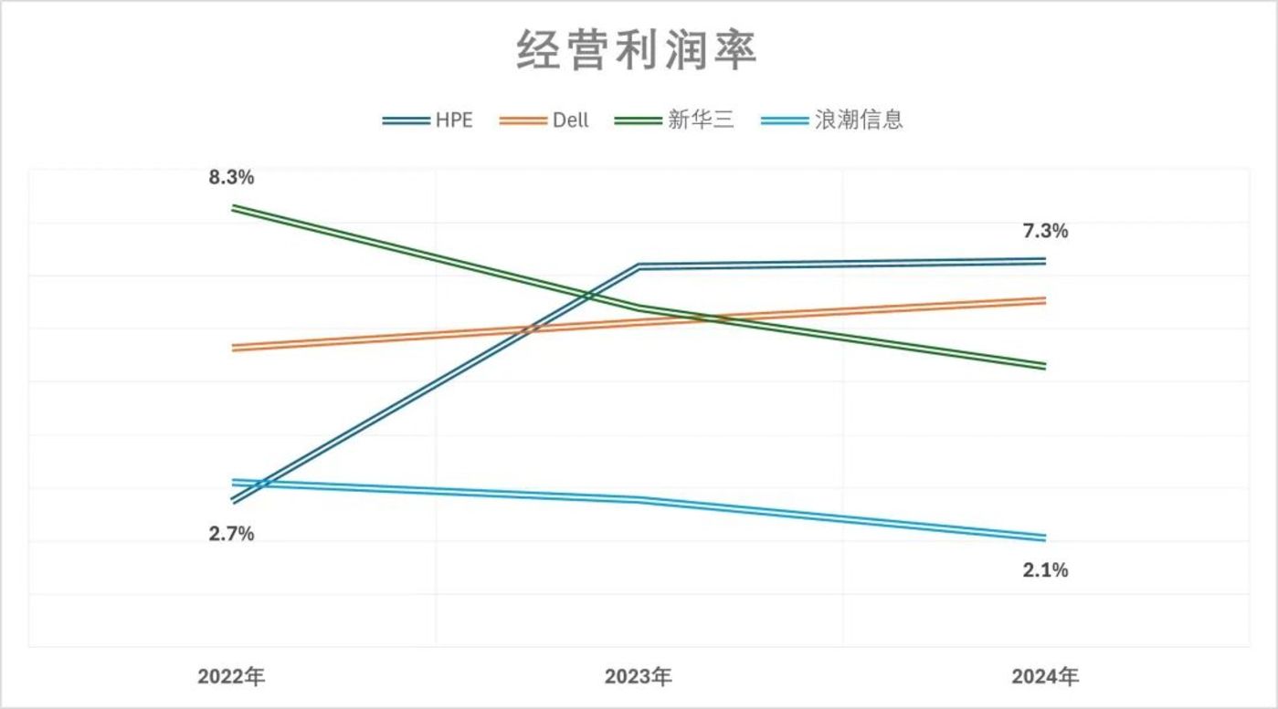 虽然AI行业景气度的提升也推动这些服务器厂商的营业收入大幅提升,但却并未带动其利润水平显著增长,以Dell、HPE、浪潮信息、新华三等为首的主流服务器厂商的经营利润率长期徘徊在10%以下。
