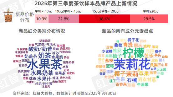 从价格分布来看,第三季度茶饮样本品牌的新品单杯价格主要集中在15元≤单杯<20元和20元及以上这两个区间内,占比分别为38.4%和28.5%。