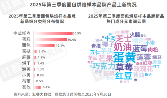 2025年第三季度,在红餐产业研究院监测的面包烘焙品牌中,有40个面包烘焙品牌共推出了1,025 款新品。从面包烘焙新品的细分种类来看,中式糕点类的新品数量最多,共推出了364款,占新品总数的35.5%。