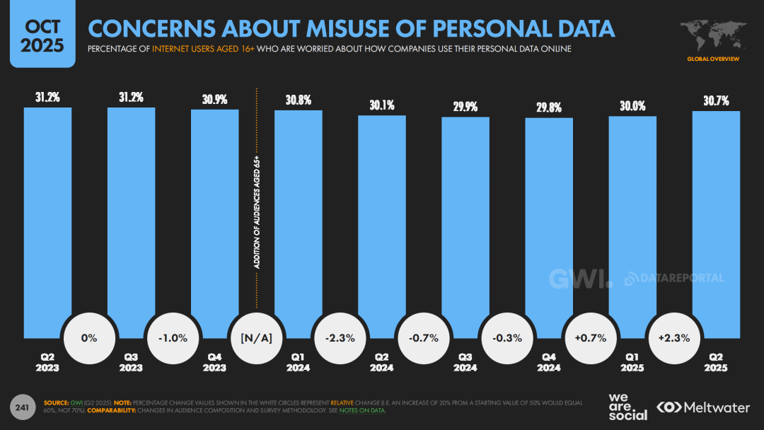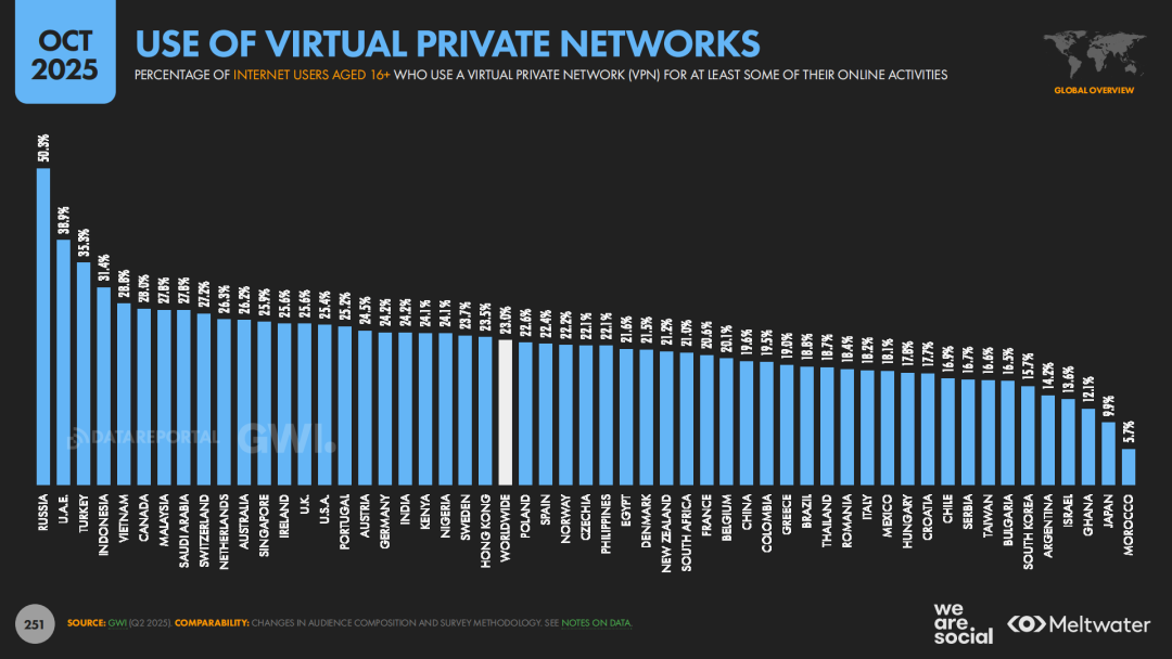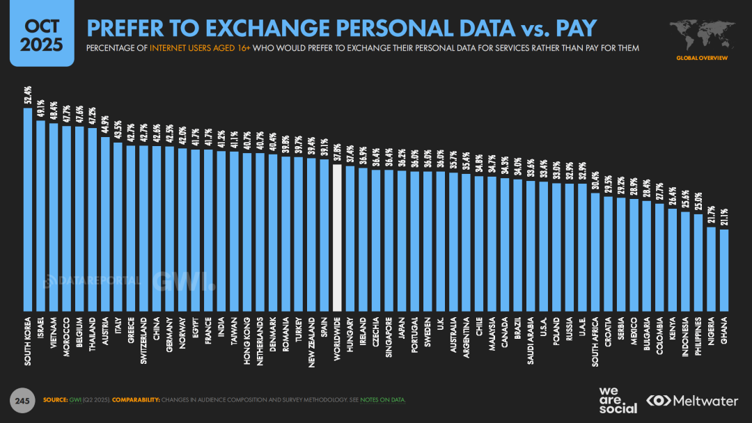 报告在隐私和数据部分呈现出一种全球共通的矛盾心态。一方面,约30.7%的用户明确表示担心企业滥用个人数据,“广告太多、跟踪太紧”是许多网民的真实感受;23%的用户使用VPN保护隐私,在俄罗斯、阿联酋、土耳其等国,VPN使用率尤其突出。另一方面,约37.8%的用户愿意“用数据换服务”,这意味着可以用个人信息让渡来能换取更顺畅的体验、更精准的推荐或更优惠的价格。
