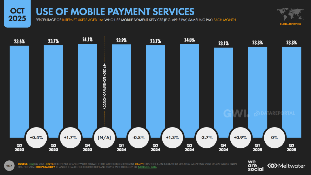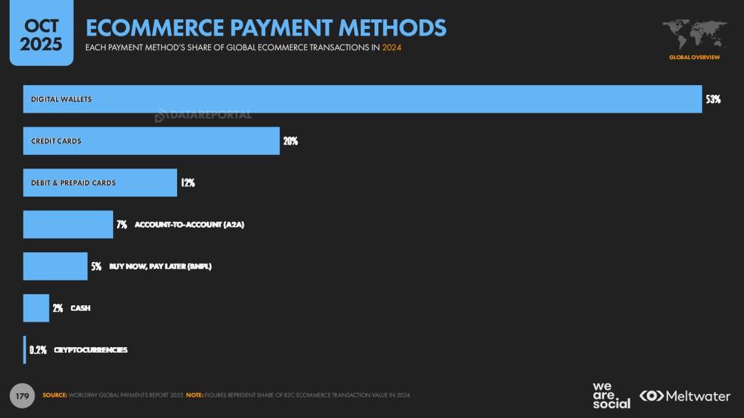 在驱动因素上,价格和履约体验仍然是用户线上购物的主要考量。与此同时,数字支付的基础设施也在迅速夯实。报告指出,约53%的电商交易通过数字钱包完成,约有1/4的全球网民每月使用移动支付服务。这表明,数字钱包正在取代传统银行卡成为主流支付方式。