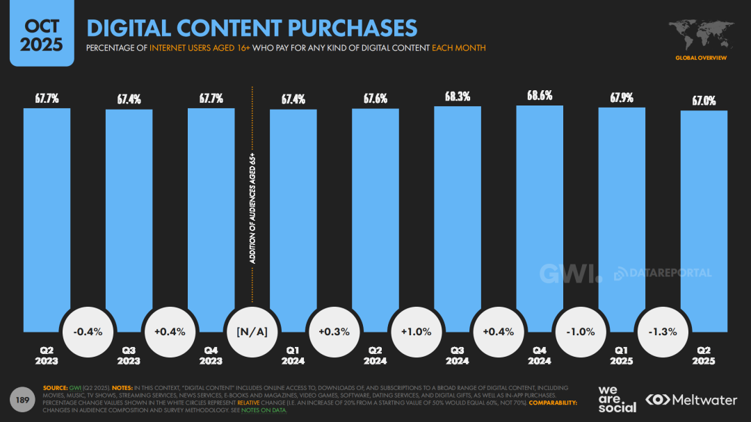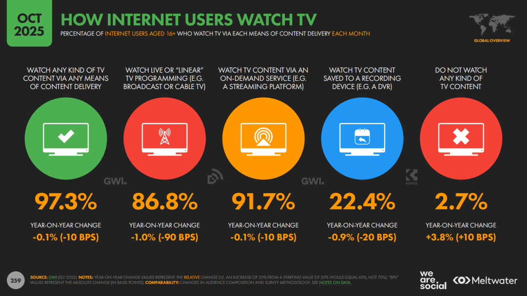 内容消费层面,流媒体与短视频共同构成了全球注意力的“新底盘”。报告显示,91.7%的互联网用户每月会观看流媒体电视内容。同时,TikTok、Reels等短视频平台的观看时长持续攀升,形成“短视频种草”加“长视频陪伴”的复合消费路径。