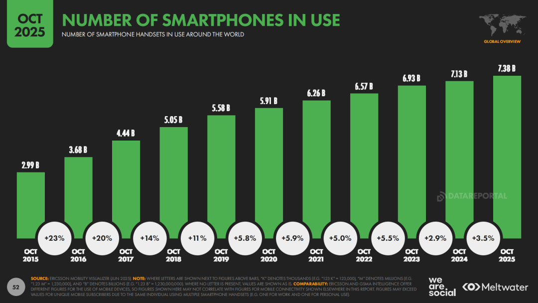 全球数字空间,正在悄然改写企业“走出去”的底层逻辑。近日,Meltwater与We Are Social联合发布的《Digital 2026 Global Overview》(下称“报告”)显示,截至2025年10月,全球人口约82.5亿,其中移动电话用户约57.8亿,互联网用户约60.4亿,社交媒体用户约56.6亿,对应渗透率分别为70.1%、73.2%和68.7%。同时,全球互联网用户同比增长5.1%,社交媒体用户同比增长4.8%,96%的网民通过移动设备上网,智能手机用户数约73.8亿,移动互联网已经成为真正意义上的“默认入口”。