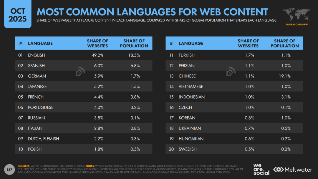 此外,报告还提醒了一个容易被忽视的维度:全球网页近半为英文,而英语母语人口不到两成。这意味着,在很多下沉市场,谁能更好地用当地方言讲故事、用本地语境表达价值,谁就更有可能在数字营销上占得先机。