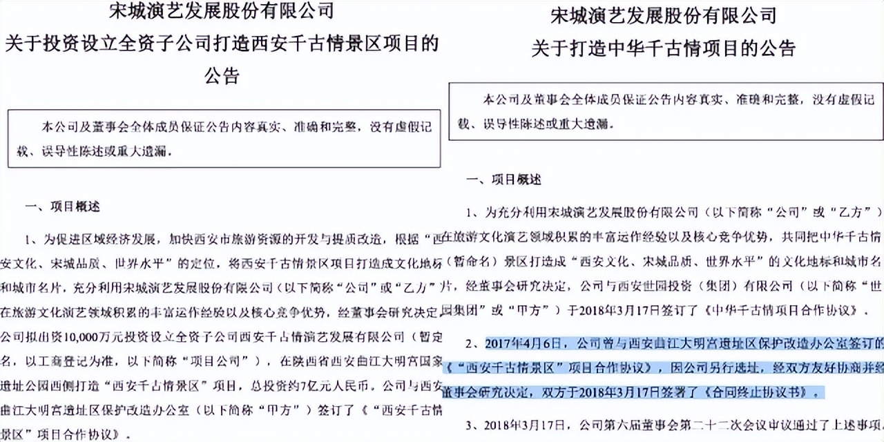 果然,约一年后,大明宫景区选定的地址还是黄了。2018年3月,宋城演艺宣布“因公司另行选址,原《“西安千古情景区”项目合作协议》终止”,同时与西安世园投资(集团)有限公司签订了《中华千古情项目合作协议》。