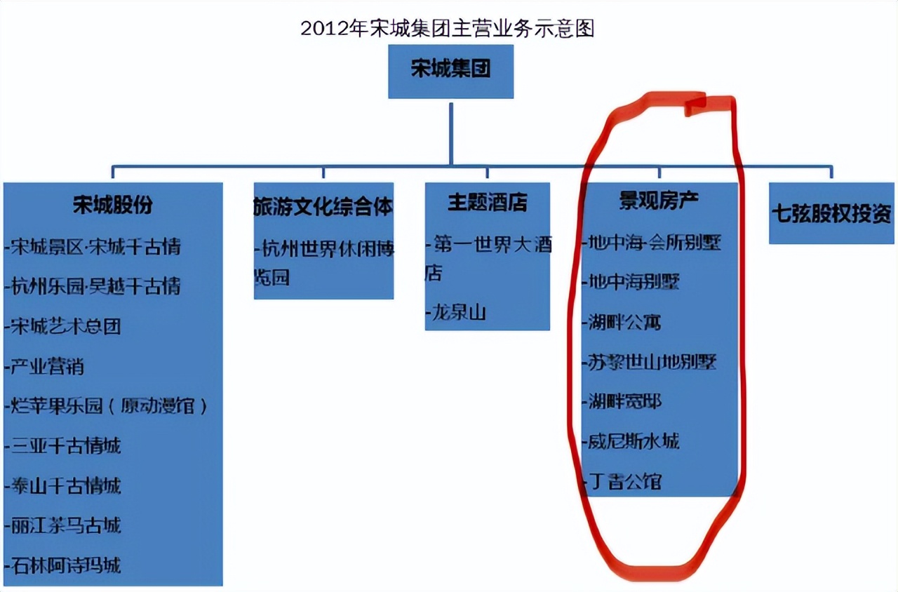2012年6月,高通智库的一份研究报告将宋城集团的业务拆解为:“以宋城股份为代表的旅游演艺业务为先头部队,景观房产、酒店及文化创业产业群为两翼。”