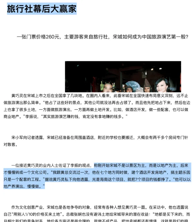 对于宋城演艺在其中的实质角色则分析为:“宋城股份的‘旅游+演艺’模式虽然是目前集团扩张的主体,却也是集团的‘先头部队’,整体上是为地产板块服务的,地产板块是造血机器,‘旅游+地产’才是宋城集团实质上的核心。