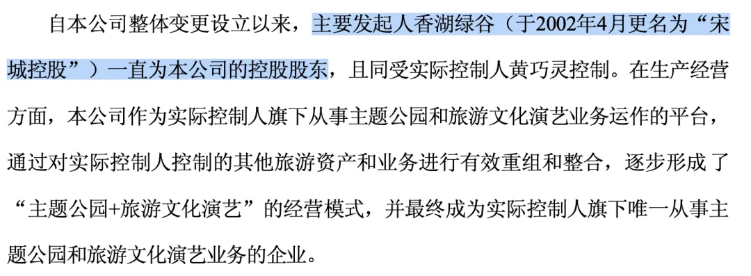 杭州宋城集团控股有限公司前身为宋城演艺的主要发起人、控股股东“杭州香湖绿谷旅游开发公司(于2002年4月更名为“宋城控股”),实控人为黄巧灵。